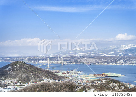 測量山から見た冬の室蘭港、白鳥大橋 室蘭市