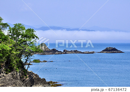三陸復興国立公園 みちのく潮風トレイル 志津川湾 南三陸町小藤浜の岩礁の先にたなびく海霧