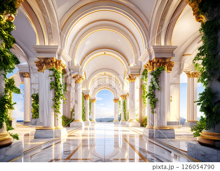 白い建物 大広間 柱 アーチ 門 神殿 天国 光 イメージ 背景 壁紙