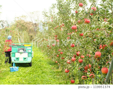 たわわに実った高密植栽培のふじリンゴ、宮美ふじを運搬車で収穫する農家の作業風景