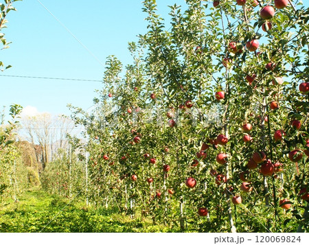 収穫期を迎えた高密植栽培のリンゴ園と、真っ赤に色づいたリンゴ、宮美ふじ