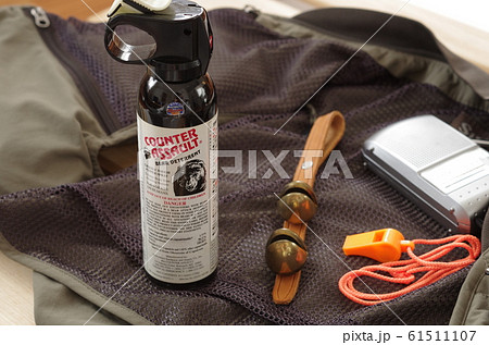 クマ鈴と爆竹(トレッキングポール、登山靴、帽子)