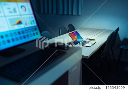 夜の部屋でタブレットがグラフを表示