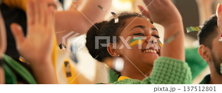 Excited football fans supporting spanish national team in live soccer match at stadium.