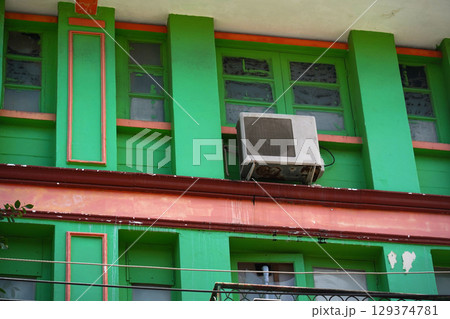 Air conditioning on facade of building and windows in southern hot country and disco ball.