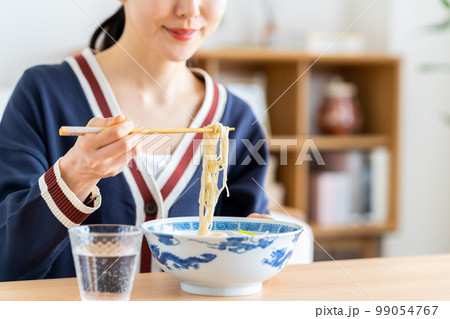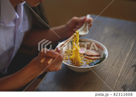 ラーメンを食べる若い女性