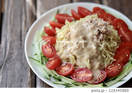 ゴマだれで食べるツナとミニトマトの冷やしラーメン