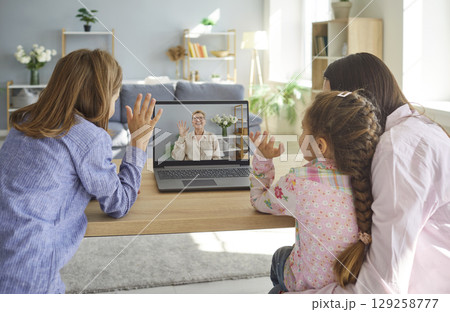 Happy family having video conference with grandmother online, waving hello