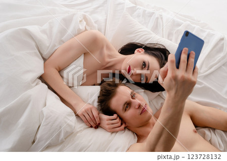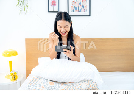 Front view of beautiful Asian woman sit on bed and express success feeling and happiness during play game on her mobile phone with day light