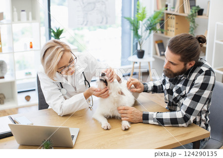 Veterinarian examines white dog with young adult male owner in modern clinic setting with plants and equipment emphasizing pet healthcare