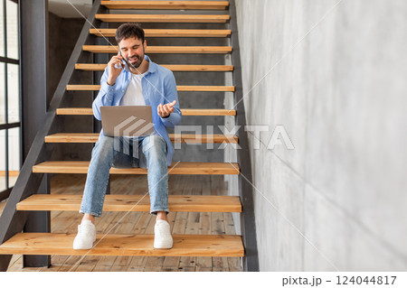This image shows a man sitting on a wooden staircase in a modern home, talking on a phone and using a laptop. He is wearing a blue shirt and jeans. He is smiling and appears to be enjoying his work.