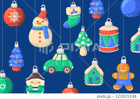 Vector illustration of hanging Christmas ornaments. Car, tree, drum, snowman. Festive background.