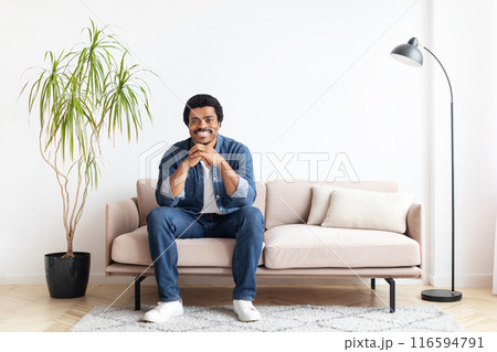 African American man is seen sitting comfortably on a couch in a well-lit cozy living room. The room features a modern design with a coffee table, rug, and framed artwork on the walls.