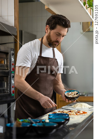 Man works pizza in kitchen adding ingredients carefully preparing food