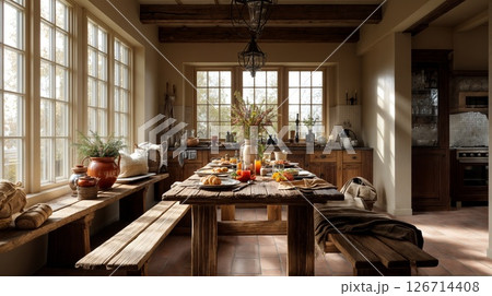 Rustic Farmhouse Kitchen Bathed in Golden Light with Autumn Breakfast Table