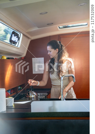 Young woman standing and preparing tea in kitchen in cabin of modern yacht during sailing in sea. Yacht life concept