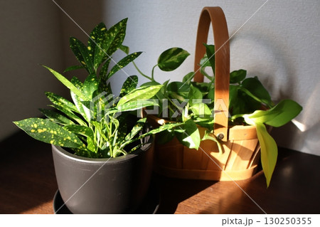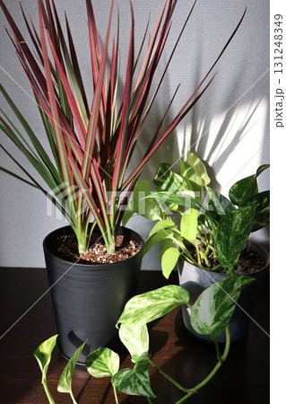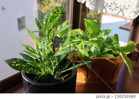 窓辺に置かれた観葉植物のポトス、クロトン、パキラ