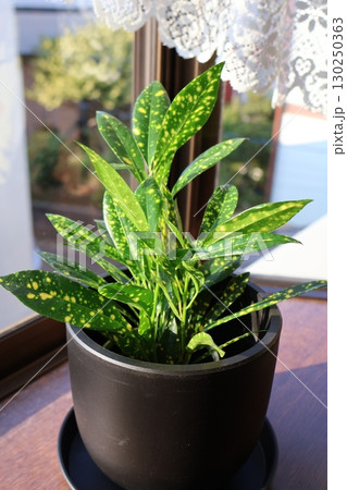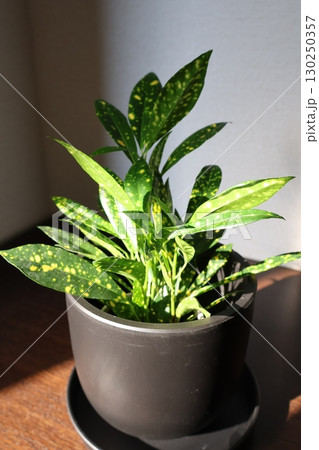 窓辺に置かれた観葉植物のクロトンとパキラ