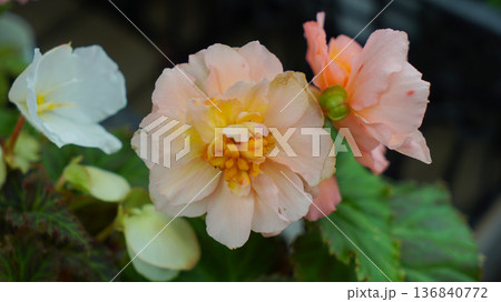 Lush macro image of pink and peach Begonia Elatior flowers with delicate, layered petals