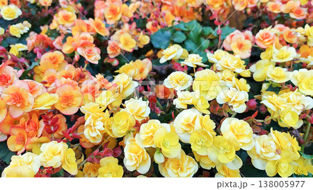 Beautiful double-petal begonia in yellow and orange blooming in a lush garden.