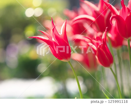 陽射しを受けて輝く満開のチューリップ