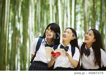 竹林でガイドブックを開く三人の女子高生