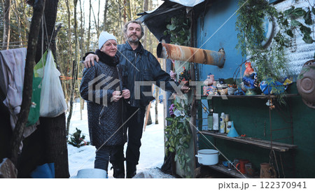 Homeless couple surviving winter near makeshift shelter, depicting harsh realities of addiction and urban poverty
