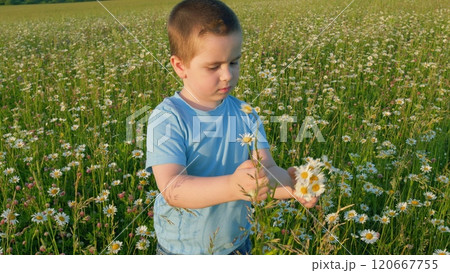 Child Collects A Bouquet Of Flowers On Field. Little Boy Picking Flowers Lifestyle. Close Up.