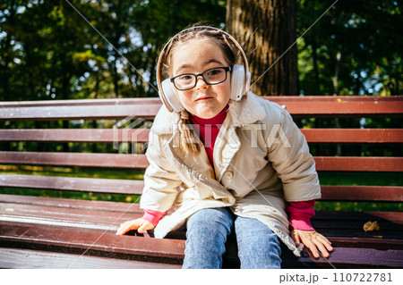 Beautiful little girl in eyeglasses with down syndrome smiling and looking into camera with cute facial expression. Child with headphones sitting on bench at sunny autumn park outdoor.