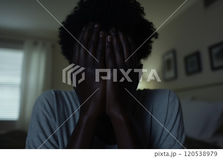 A person with hands covering their face in a softly lit room, conveying a moment of quiet reflection