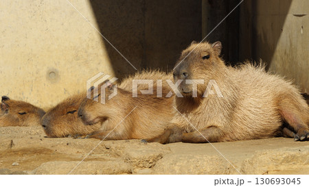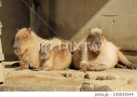 身を寄せる冬のカピバラの親子