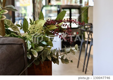 フェイクグリーンの寄せ植えが飾られているカフェ店内