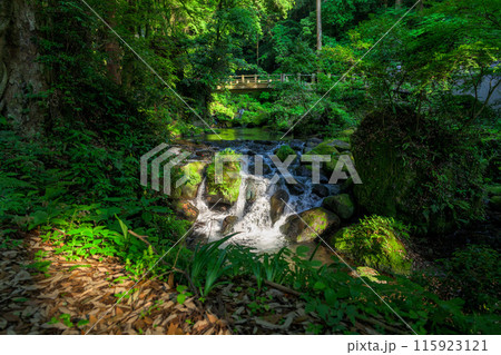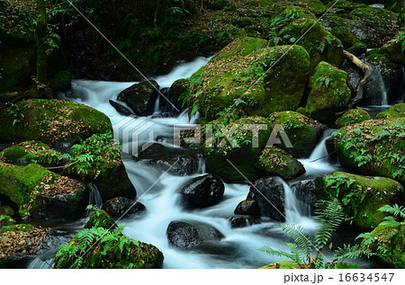 白糸の滝 渓流と新緑 「数十万年前の火山岩からなる美しい白糸の滝(別名「寄姫の滝」)」 阿蘇郡西原村