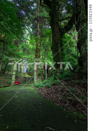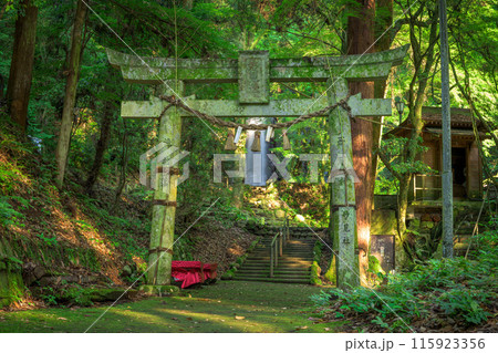 白糸の滝 鳥居と新緑 「数十万年前の火山岩からなる美しい白糸の滝(別名「寄姫の滝」)」 阿蘇郡西原村