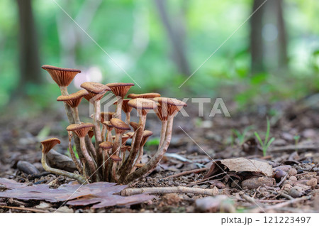秋の広葉樹林に自生するナラタケモドキ