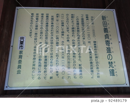 新田義貞寄進の梵鐘、宍粟市指定文化財、南北朝時代の武将新田義貞が播磨の守に任じられた、説明の看板