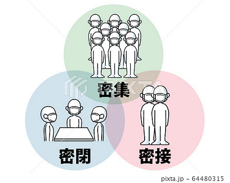 ロナウイルス予防の避けるべき3密、密閉空間、密集空間、密接空間のイメージ図