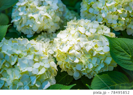密集する白い紫陽花、アナベル、光が当たるアナベル