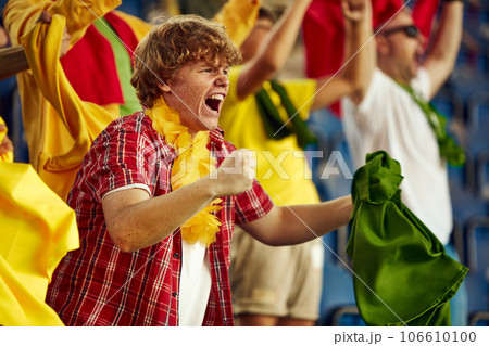 Emotional people, loud sport fans on tadium, attending soccer match and cheering up favourite team during game