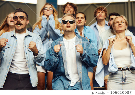 Group of port enthusiast attending football match, emotionally shouting, cheering favorite team during game