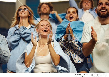 Feeling happy. Men and women, football fans cheering up favourite team in stadium during game. Winning