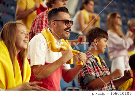 Tense game moment. Excitedand worried young people, sport fans on stadium, cheering up favourite team during game