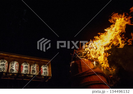 火祭りの大きな松明の炎と祭提灯・富士吉田市