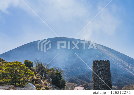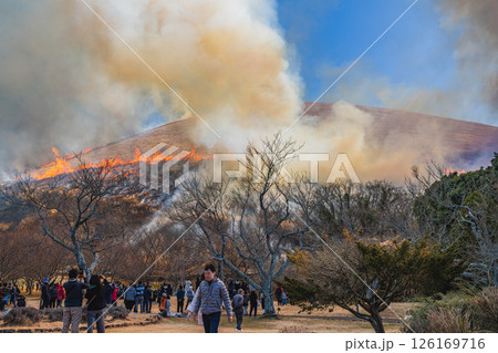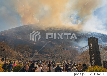伊東市の青空に映える大室山の山焼きの風景(静岡県)