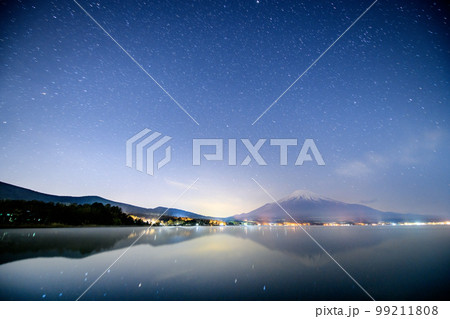 星空と富士山が山中湖の湖に映り込む幻想的な夜景(山梨県)