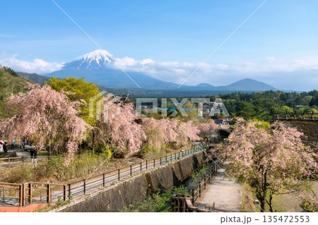 Pink sakura tree at Saiko Iyashi no Sato Nenba village and mt. Fuji