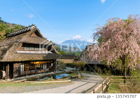 Saiko no Sato Thatch house with mt. Fuji in spring, Yamanashi, Japan