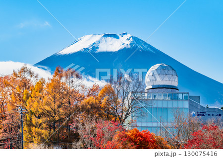 (山梨県)紅葉に包まれた富士吉田市立富士山レーダードーム館と富士山