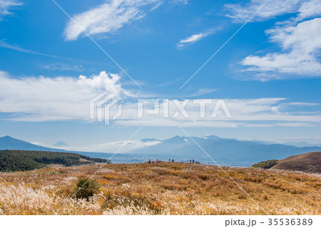 秋の長野 霧ヶ峰 富士見台 高原を散策する人々