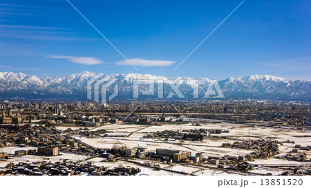 立山呉羽山展望台から毛勝山、劔岳、立山連峰 雄山、浄土山、一ノ瀬、 龍王岳、 鬼岳仰ぐ富山市の雪景色